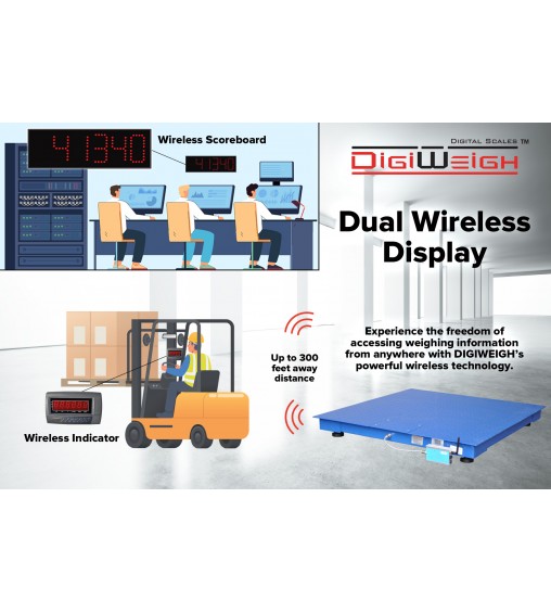 Introducing the advanced DIGIWEIGH dual wireless display floor scale, a cutting-edge solution that significantly enhances your weighing operations. This innovative product includes both a wireless NTEP indicator and a large, illuminated wireless display, making it an exceptional choice for those who prioritize clarity and convenience in weight measurement.